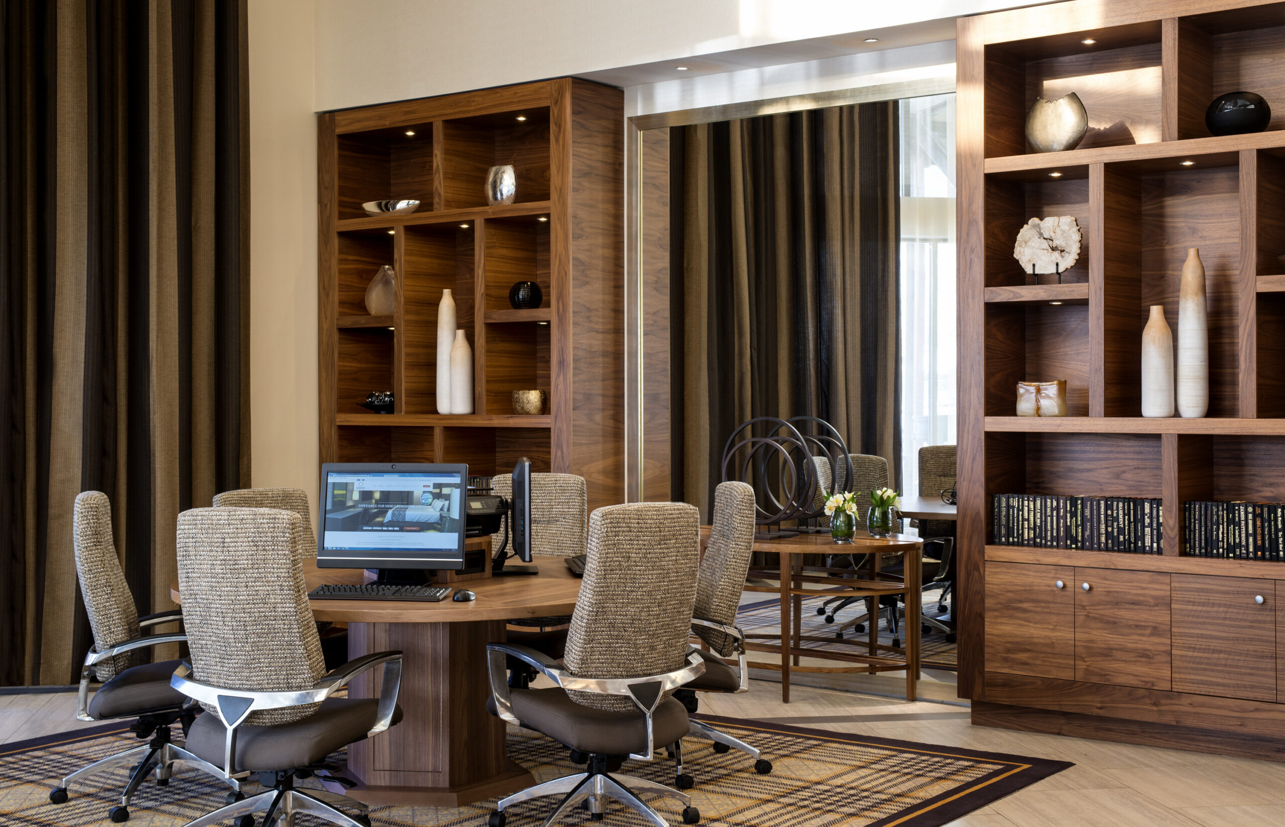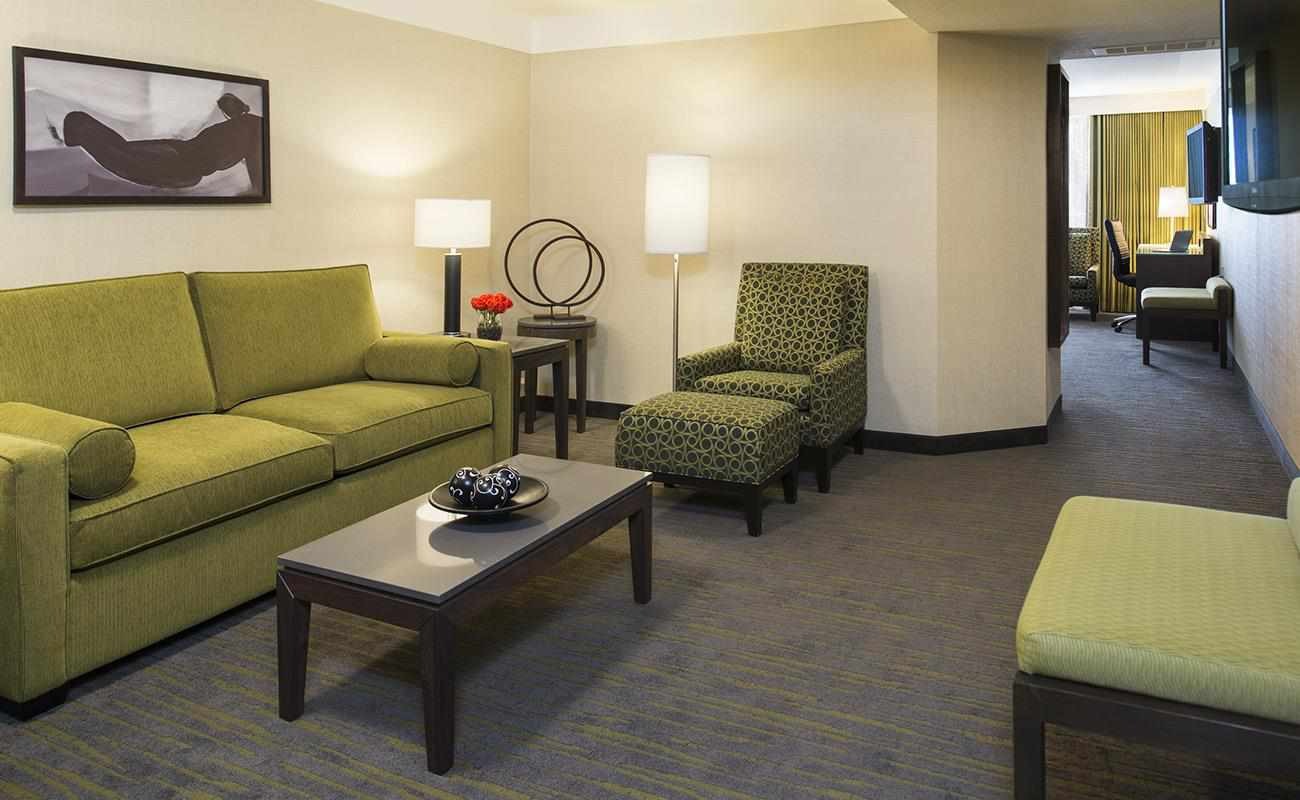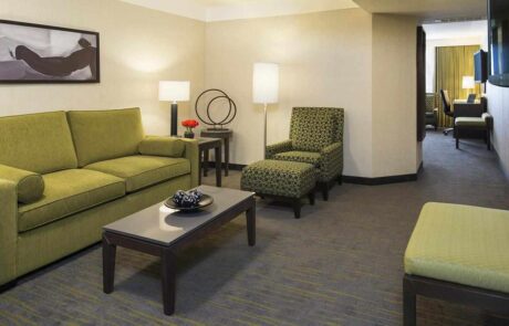 Our One Bedroom Suites offer a spacious layout with modern furnishings and soft, neutral tones—ideal for families or extended stays. A private bedroom features a King bed and balcony, while the separate living area includes a Queen-size sofa bed, work desk with ergonomic chair, reading chair, ottoman, and dining area. Bathrooms are fully renovated with new vanities, lighting, and space-saving sliding or inward-opening doors—many now feature sleek walk-in showers. These suites overlook the hotel’s tropical courtyard and include free high-speed Wi-Fi, two 42” HDTVs, microwave, fridge, in-room coffee, iron, and hairdryer.